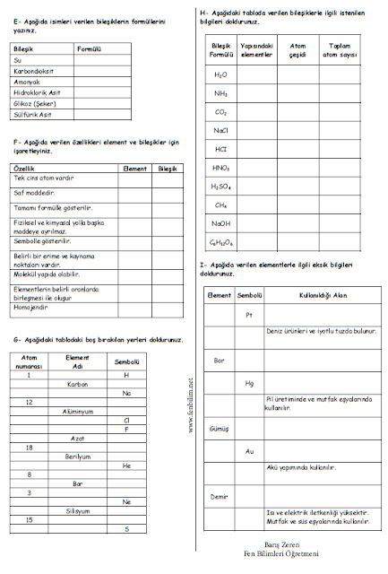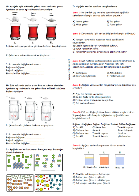 7 sinif saf maddeler calisma kagidi